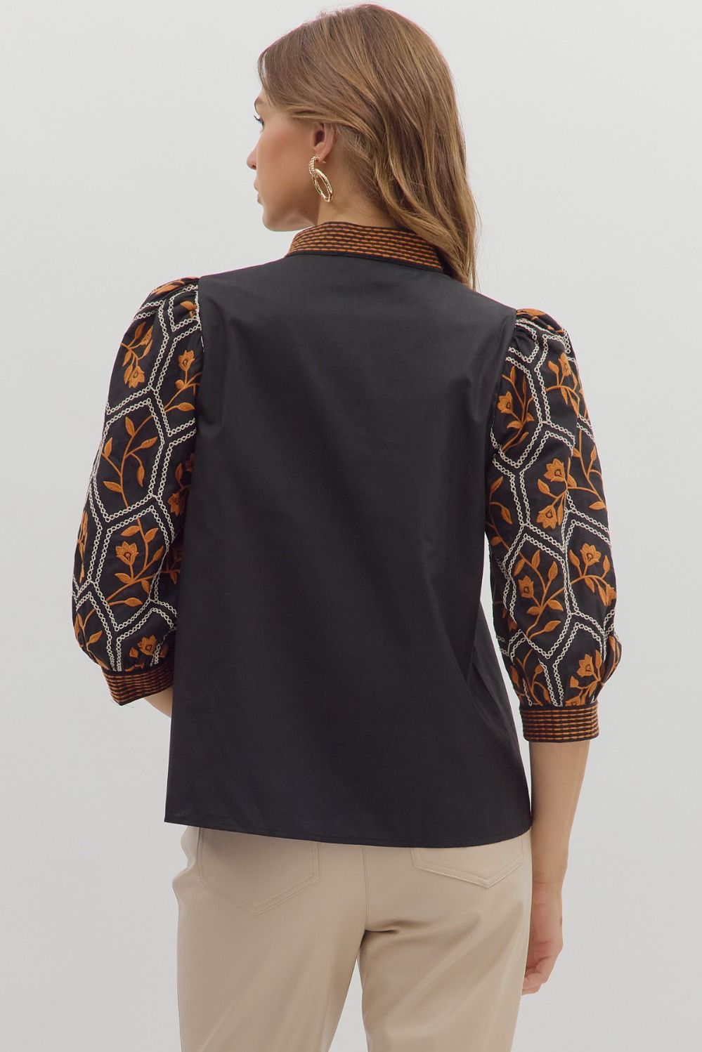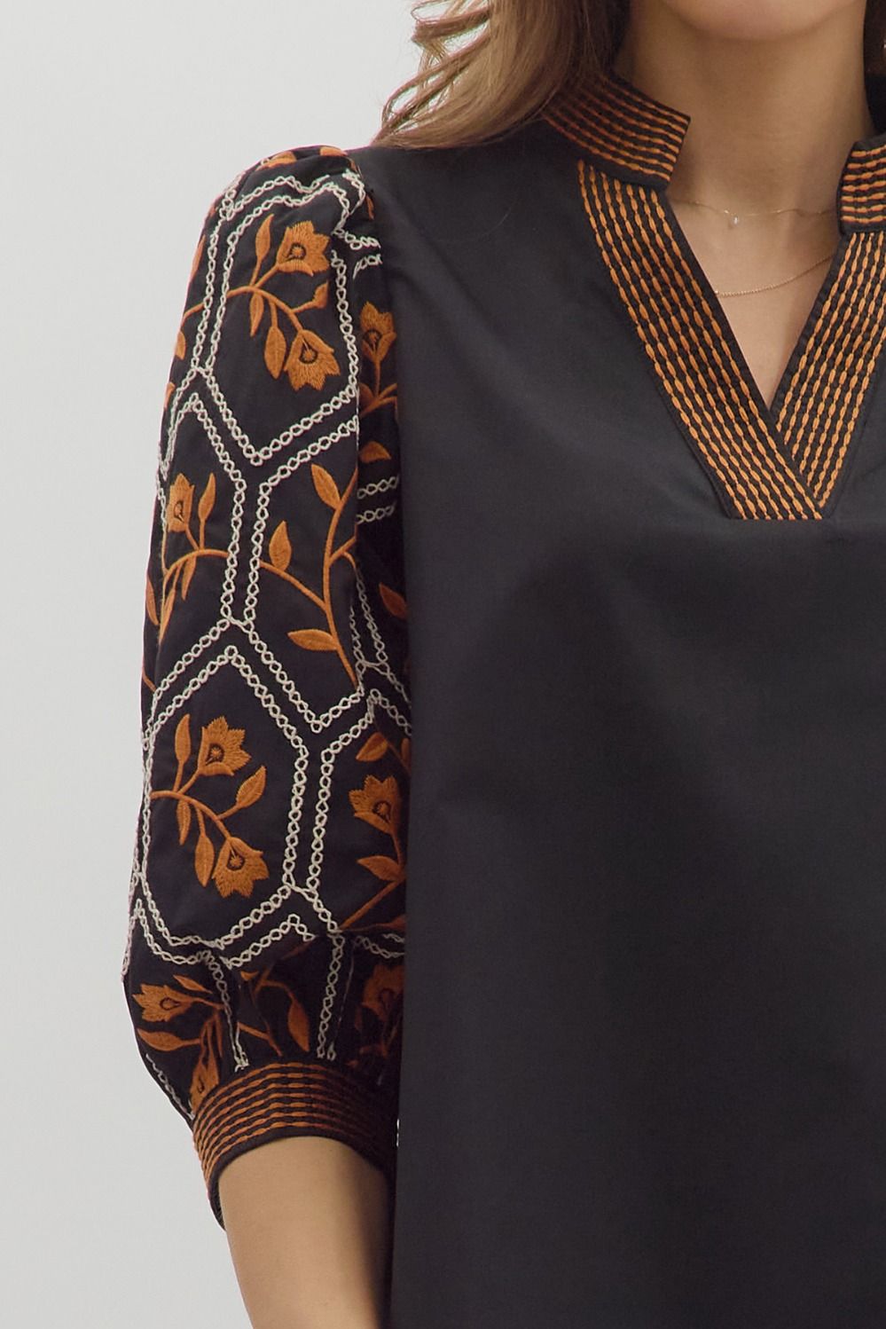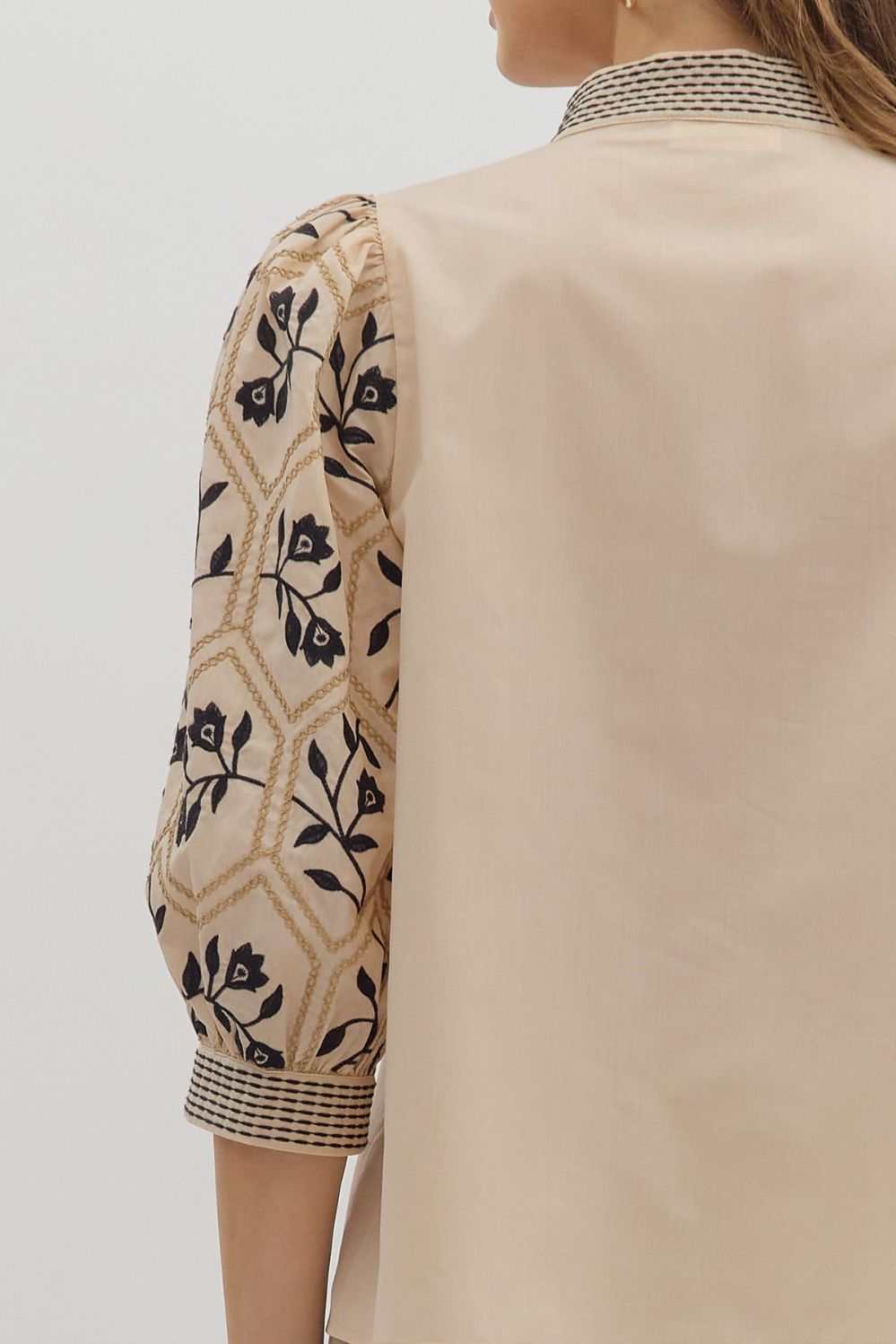 The Emberloom Top is a floral-pattern embroidered top with three-quarter sleeves, designed with an embroidered stitch–embellished band along the neckline and cuffs. Crafted from a blend of 80% polyester and 20% cotton, it offers a structured yet comfortable fit that blends artisanal detail with modern elegance.