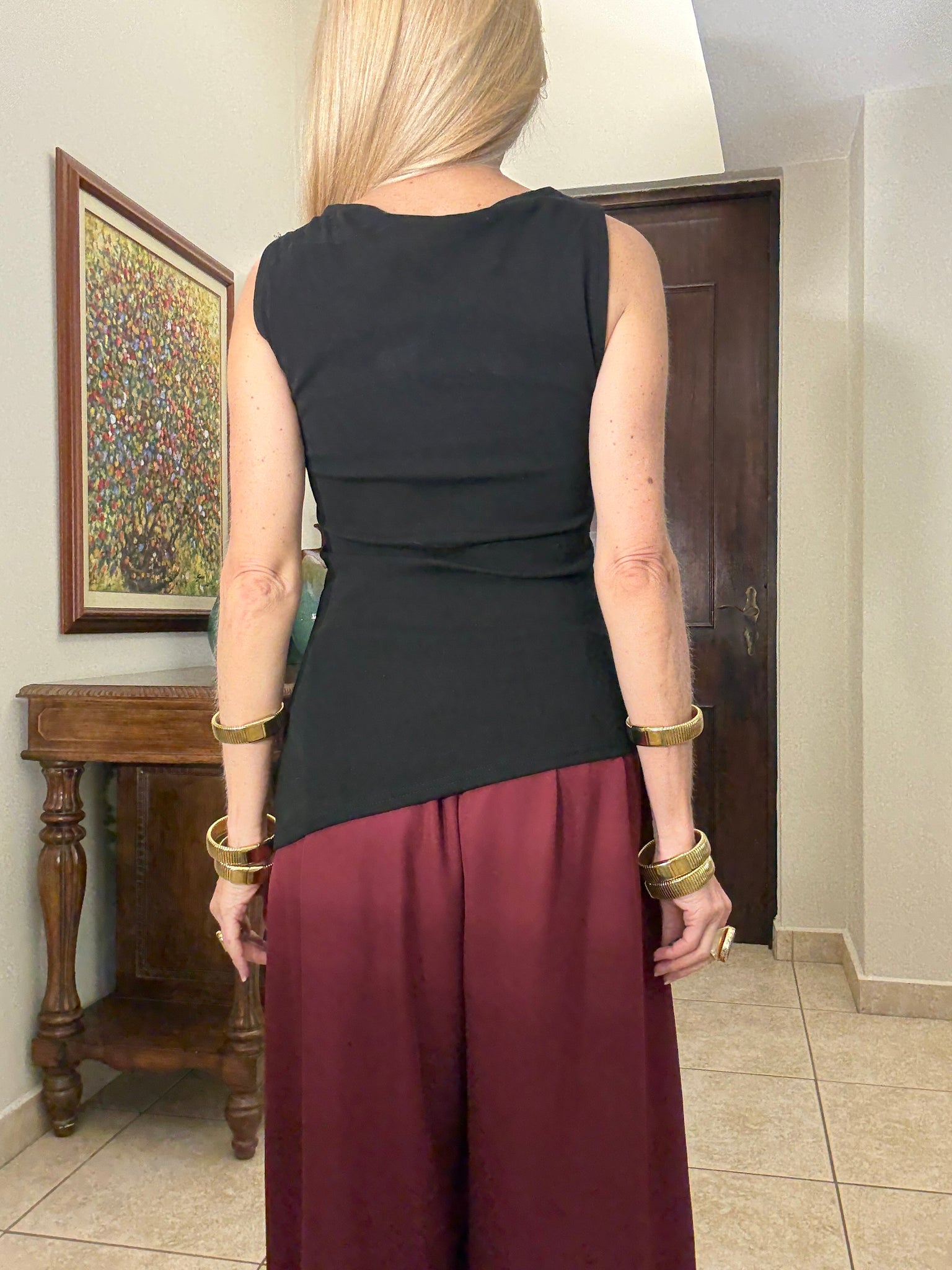 JetLine Top – A sleek essential with a modern twist. This sleeveless top features a clean silhouette with an asymmetrical hemline and subtle ruching at the waist for a flattering fit. Crafted from a soft blend of 65% cotton and 35% polyester, it’s the perfect balance of comfort and style.