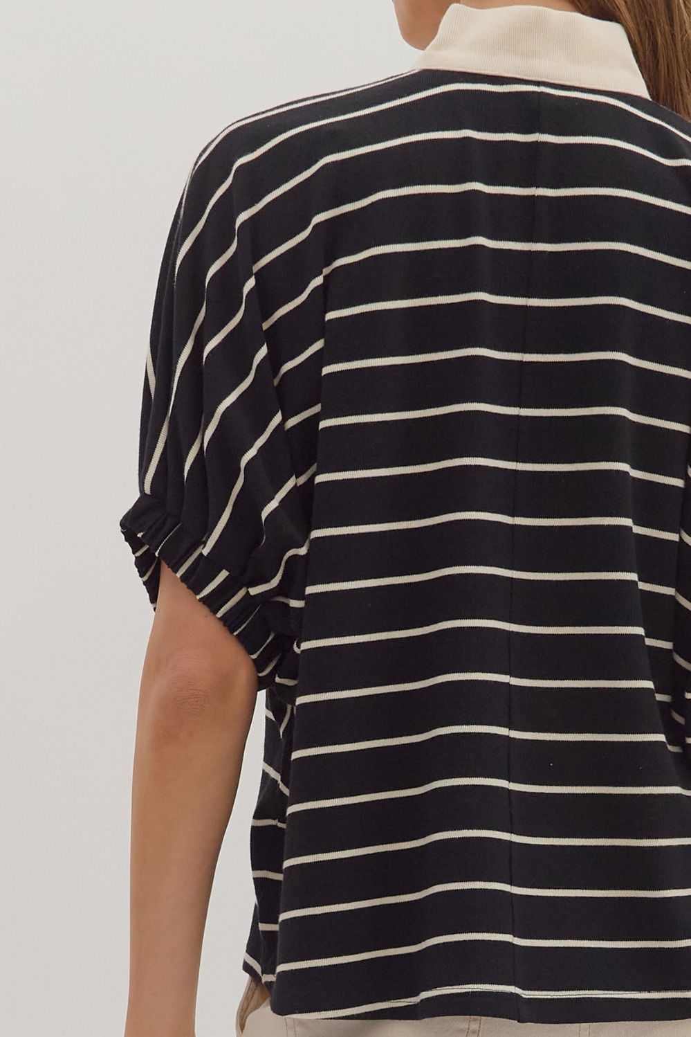 Effortlessly chic, the Linear Ease Top combines timeless stripes with a modern, relaxed silhouette. Designed with short dolman sleeves and a flattering split V-neckline, this top features a contrast trim that adds a refined touch. The elasticated sleeve openings create a subtle drape for easy comfort and style. Crafted from a soft, stretchy blend of 65% polyester, 30% cotton, and 5% spandex, it’s the perfect piece for polished everyday wear.