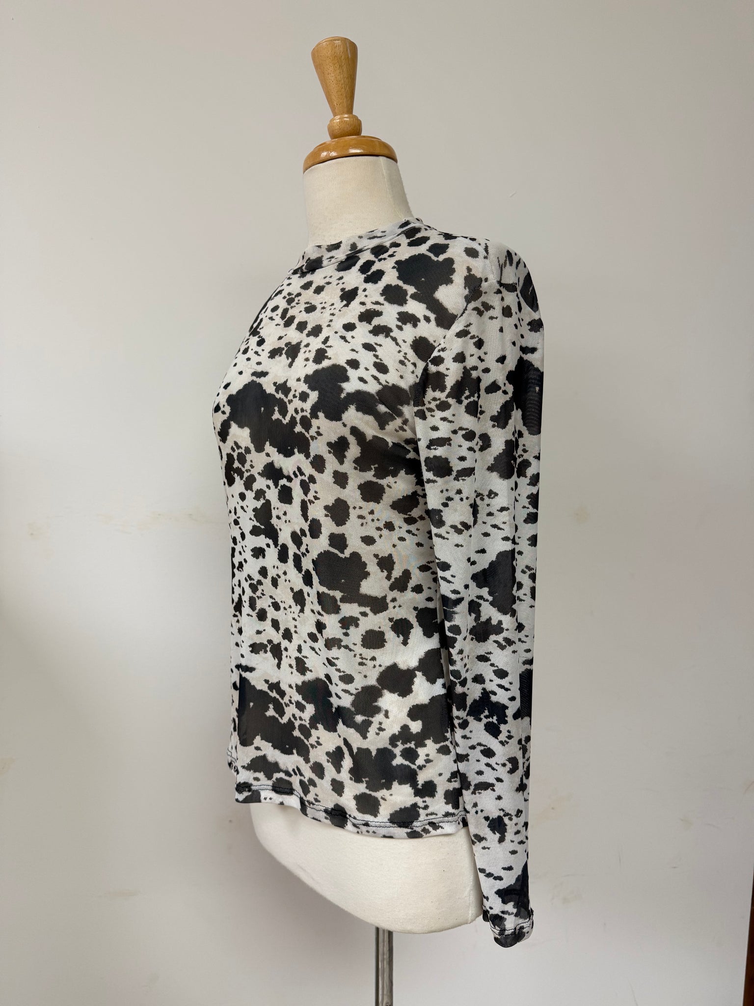 MooMoods Sheer Top — A bold mesh top that brings effortless edge to any look. Crafted from stretch sheer fabric, it features a sleek mock neck and long sleeves for a modern, fitted silhouette. Perfect for layering or styling on its own with attitude. Fabric content: 95% polyester, 5% spandex.