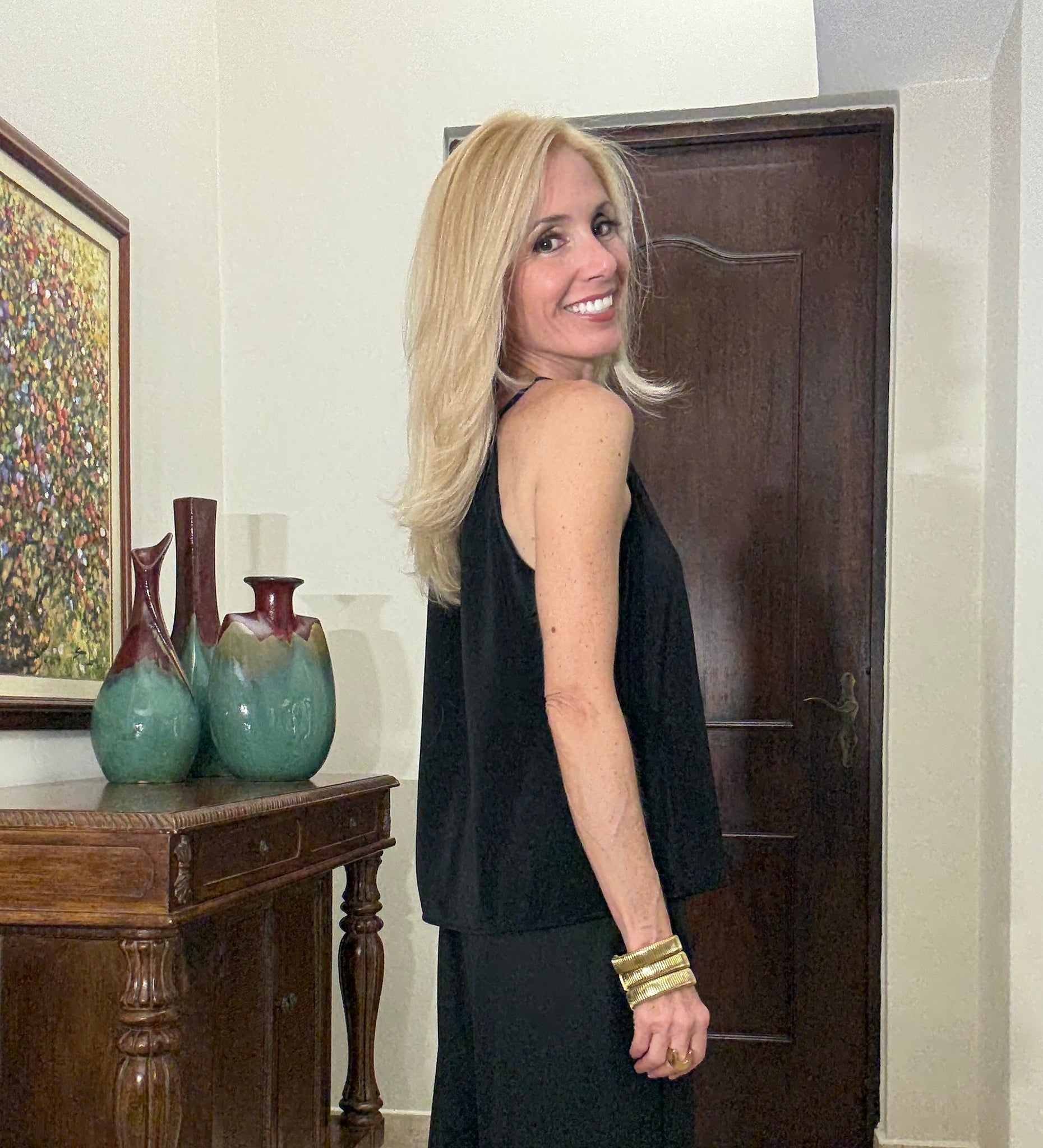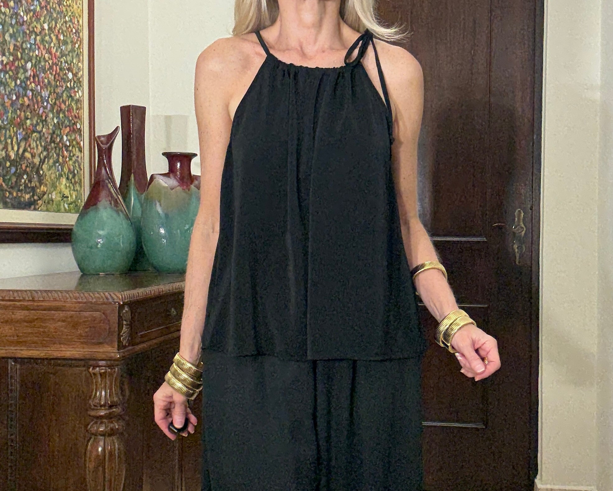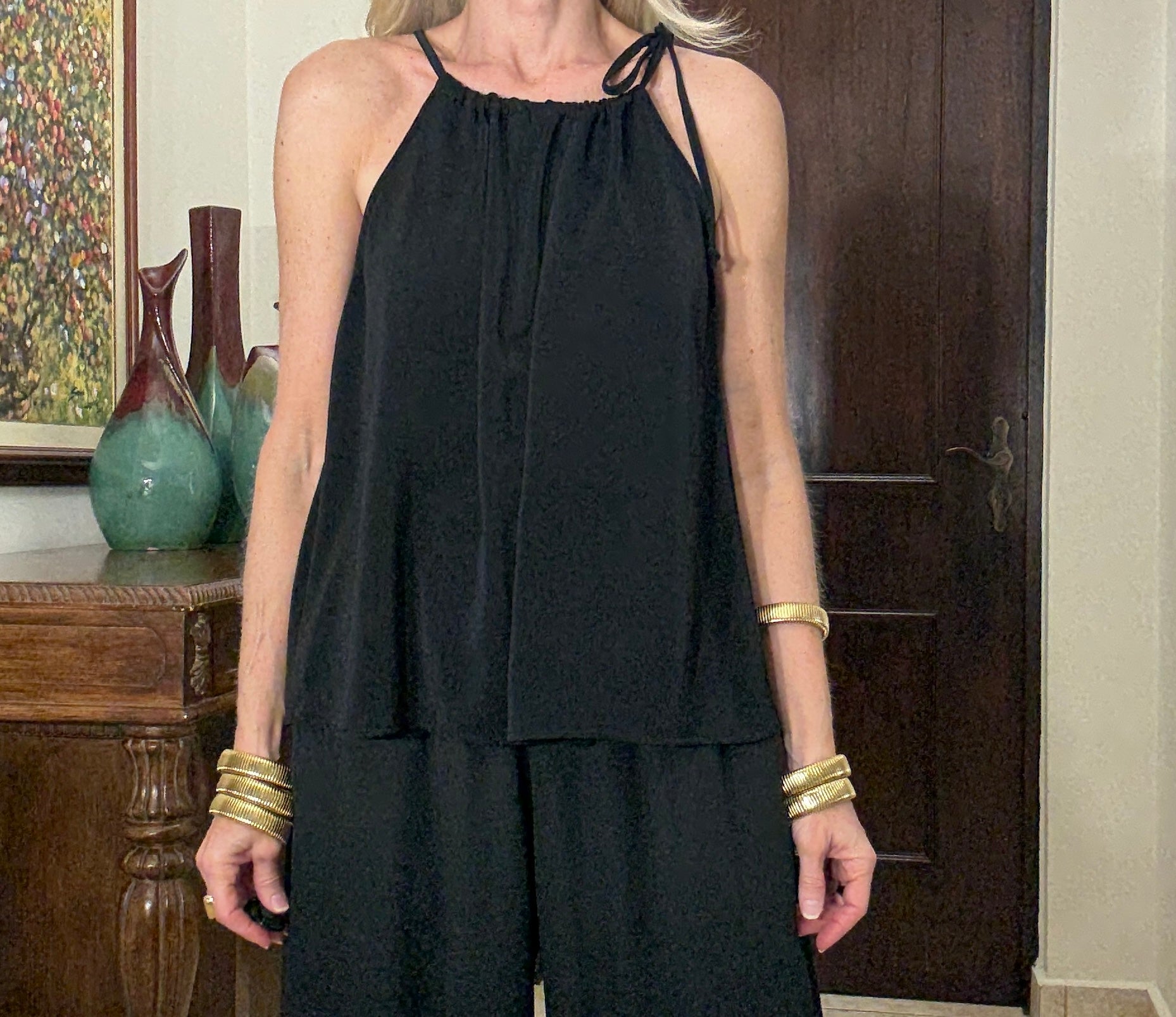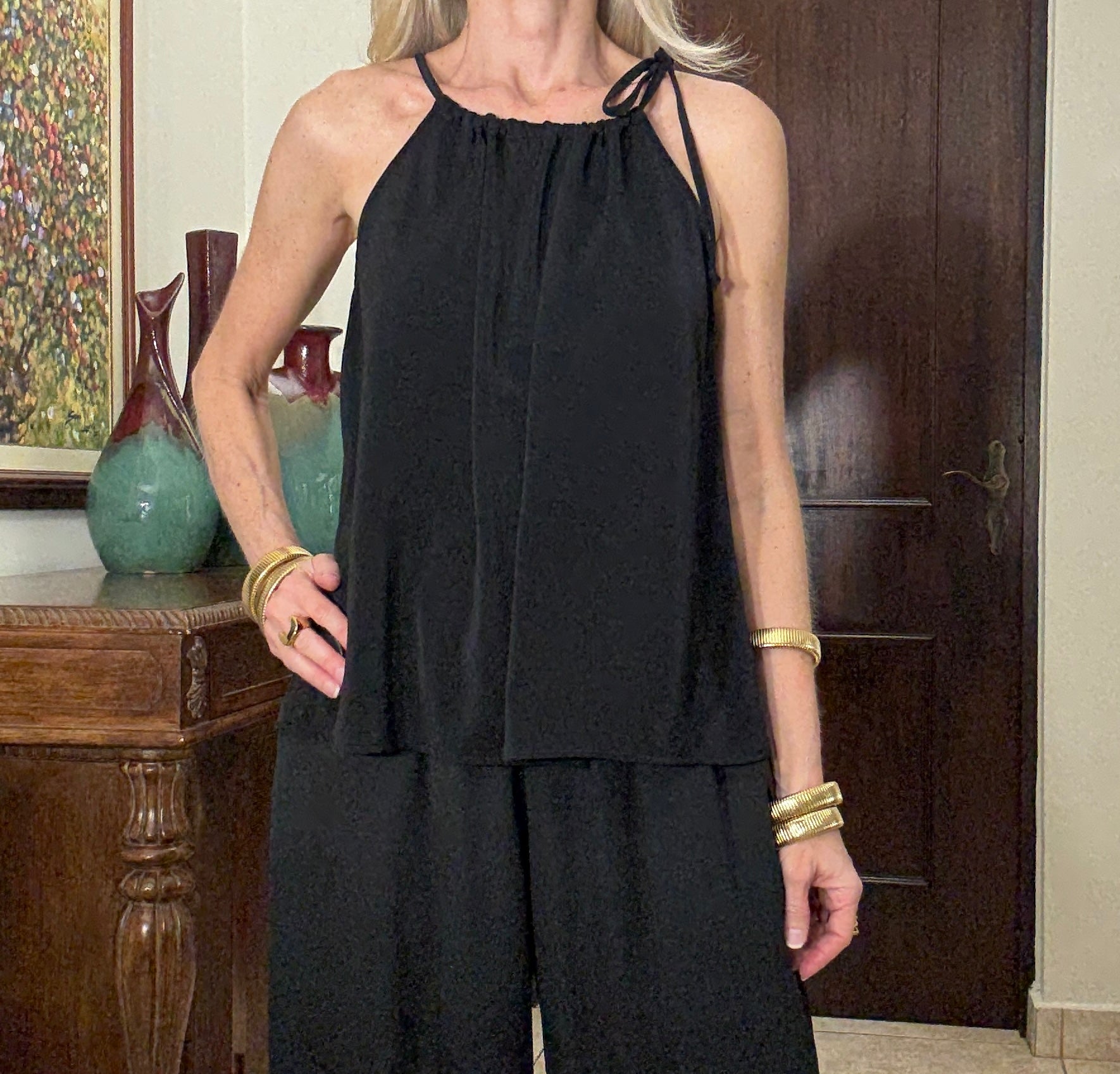 The Onyx Tide Top is a relaxed halter style with a tie that runs around the neckline, allowing you to adjust the height and fit by securing it at the side. Crafted from 100% polyester, it offers an easy drape with a modern, versatile edge. Perfect on its own or paired with the Onyx Balloon Pants for a chic, coordinated set.