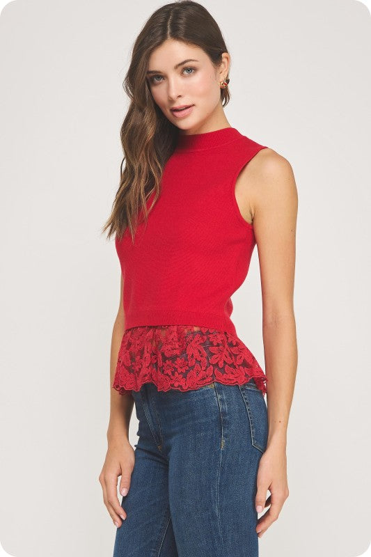 A lace-contrast mock neck knit top featuring a soft, structured body paired with a delicate floral lace peplum hem that adds a feminine flare. Crafted in a comfortable blend of 50% rayon, 28% polyester, and 22% nylon for a smooth, flattering fit.