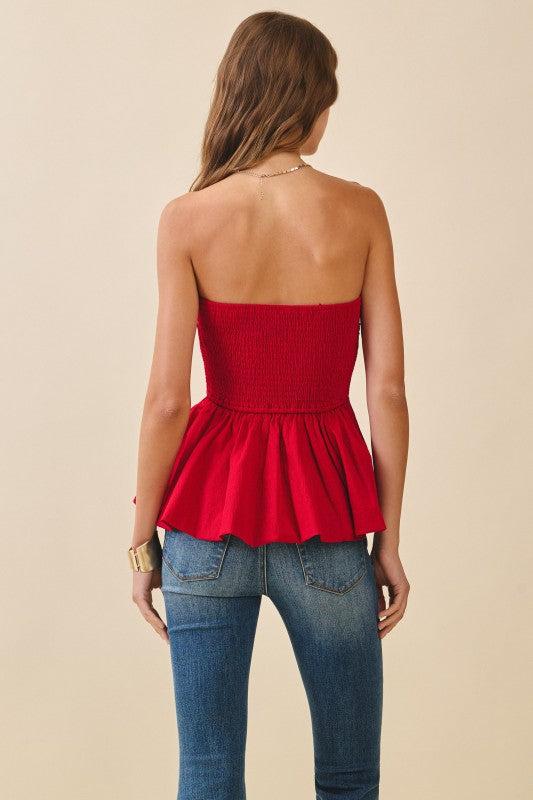 A strapless peplum top featuring a ruched bodice and a smocked back for a comfortable fit. Finished with a flared hem for a feminine touch. Fabric content: 100% polyester.