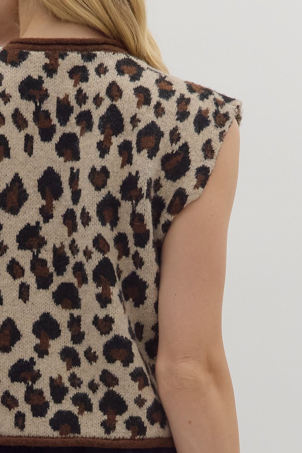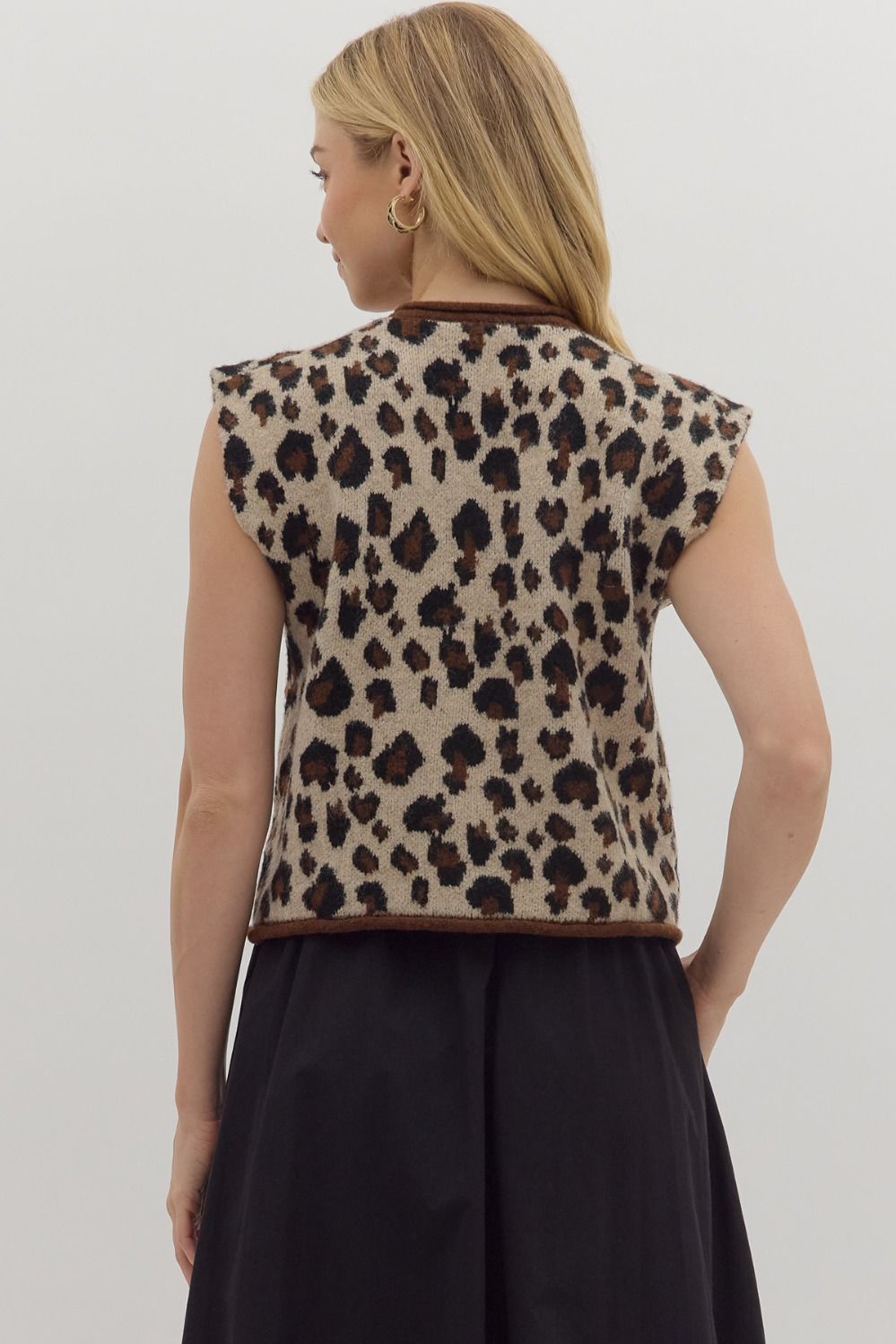 Spotted Cheek Vest is a cozy sweater-style vest featuring a bold leopard print for a touch of wild charm. Designed with a button-front closure and two front pockets, it blends style and function effortlessly. Perfect for layering over your favorite tops or dresses, this vest adds texture, warmth, and a playful edge to any look.