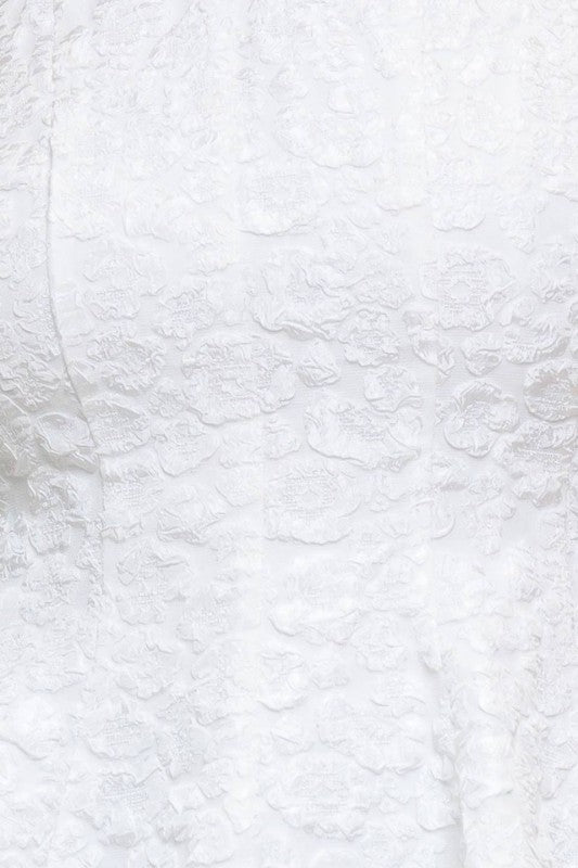 A textured woven top featuring a round neckline, charming bow details at the shoulders, and a flattering peplum silhouette. Finished with a back zipper closure for a polished touch.