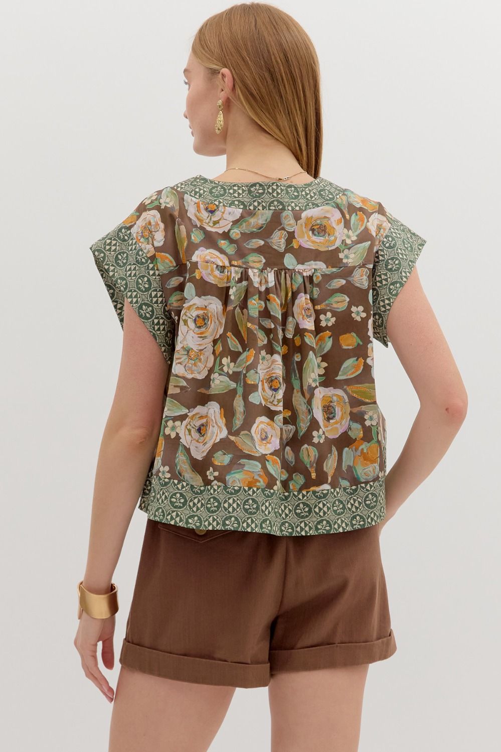 Thalia Verde Top is a multi-print pin-tuck blouse featuring exposed stitch accents and contrast pattern bands along the neckline and hem. Detailed with a soft, flowy silhouette and intricate plaquette design, it blends earthy tones with artisan charm.