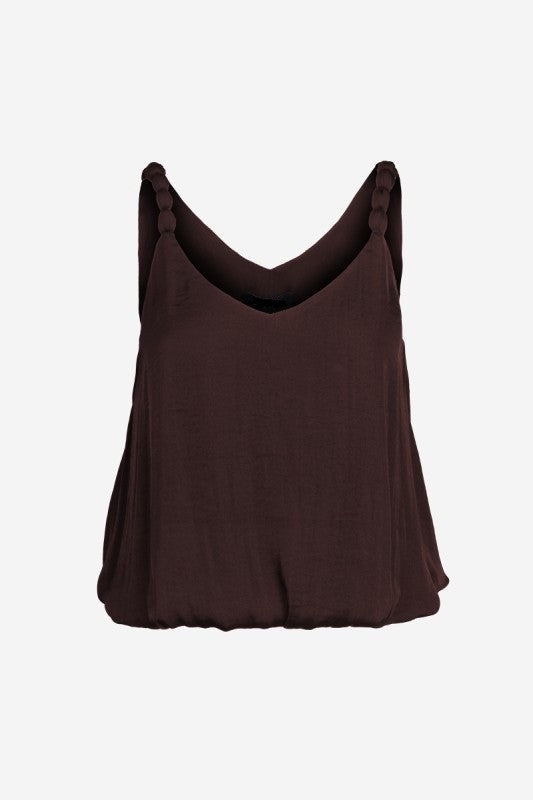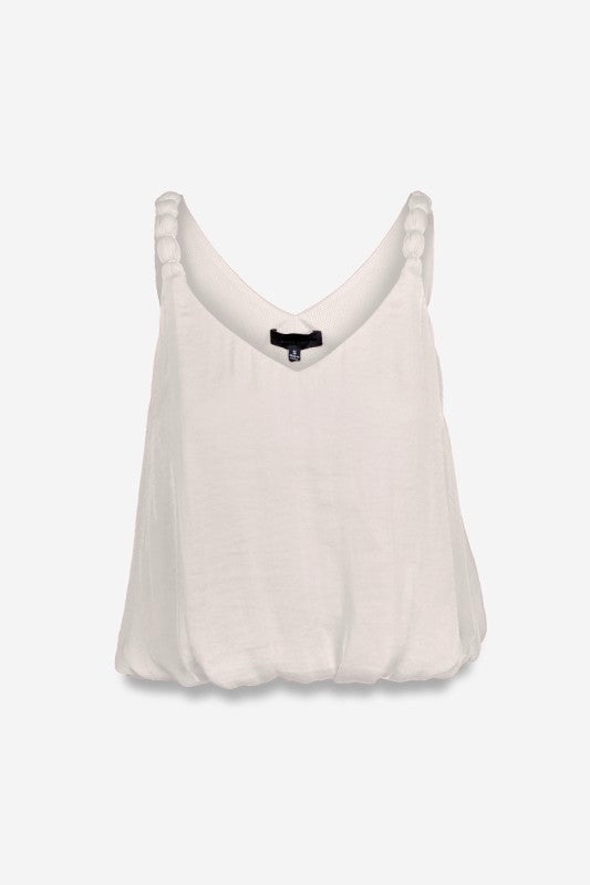 A women’s bubble hem strap-accent tank top crafted in silk-woven fabric with a soft, lightweight feel. The straps feature bold ball details—giving the piece its unique “twist” name—while adding a refined, statement touch. Designed with a bubble hem that creates volume and a modern billowy shape, this top blends playful detailing with effortless elegance.