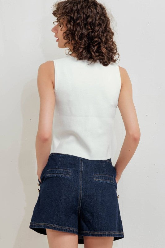 The Vanguard Vest is a sleek, solid sweater top featuring a deep V-neckline and a polished front button closure. Designed with a tailored silhouette for a refined look, it offers both comfort and structure. Crafted from a soft yet durable blend of 60% viscose and 40% nylon, it’s the perfect layering piece to elevate any outfit year-round.
