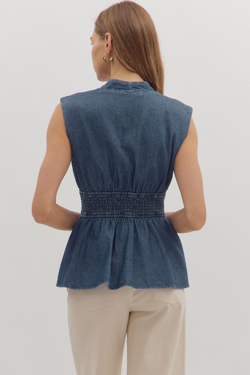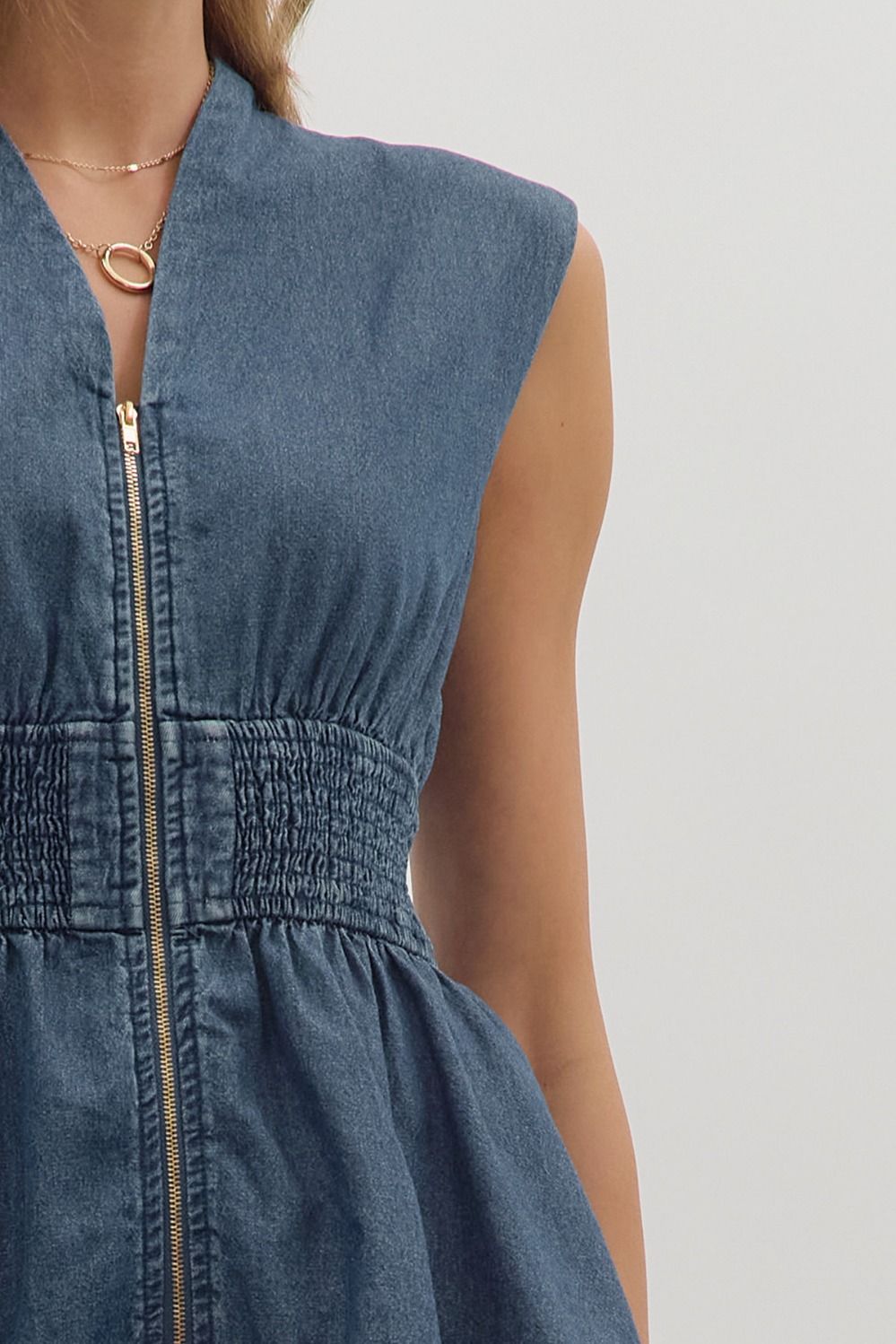 The Zipline Denim Top is a sleek and modern take on classic denim. This solid, sleeveless peplum top features a flattering wide smocked waist that defines the silhouette while adding comfort and stretch. The front zipper closure brings a touch of edge to its feminine shape, making it easy to dress up or down. Crafted from 100% cotton, it offers a structured yet breathable feel—perfect for effortless everyday style.