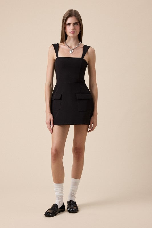 Black Illusion Romper is a bold and modern piece that looks like a chic mini dress but is actually a cleverly designed romper. It features a flattering square neckline, wide shoulder straps with adjustable detail in the back, and a smocked back panel for added stretch and comfort. The back also includes a hidden zipper closure. Though it has the appearance of a skirt, it conceals practical shorts underneath—perfect for effortless movement. Finished with stylish flap front pockets and crafted from 100% polyester.