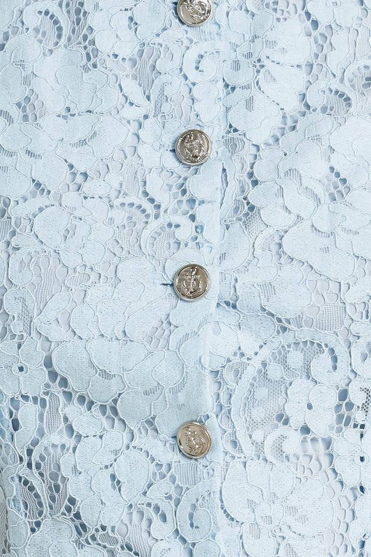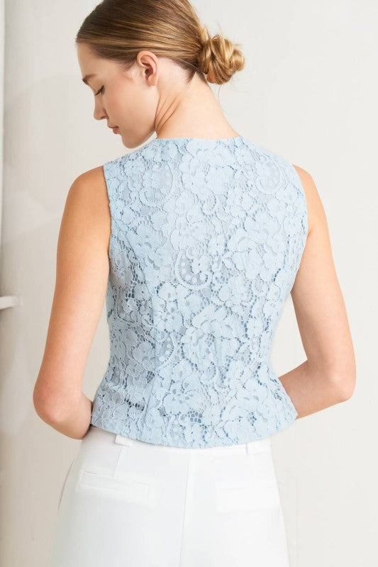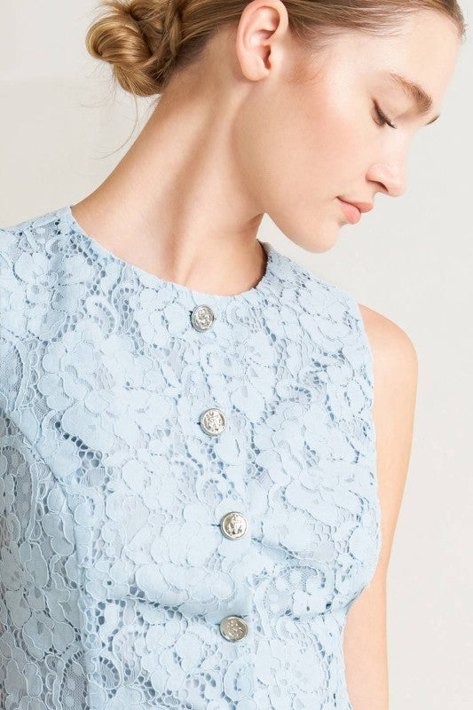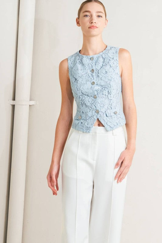 The Blue Petal Vest is a soft statement piece with a tailored edge. Crafted in a solid woven lace, this sleeveless vest features a round neckline and a front button-down design finished with silver buttons for a subtle shine. The structured yet lightweight feel makes it perfect worn on its own or layered, adding a polished touch to both casual and elevated looks. Feminine, refined, and effortlessly versatile.