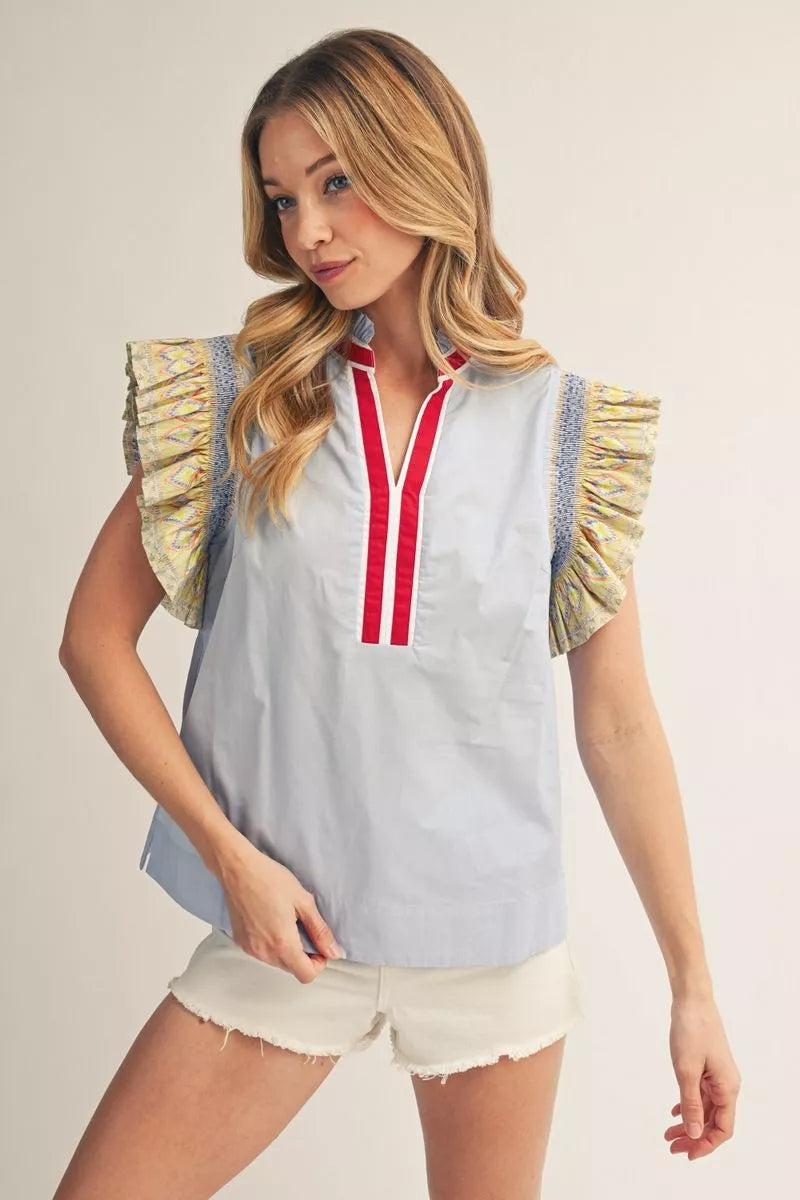 Fresh, playful, and effortlessly polished, the Brightwater Flutter Top brings a modern twist to a timeless silhouette. Designed with a flattering notch V-neckline and subtle color contrast trim, it adds just the right amount of bold detail while keeping a clean, refined look. The flutter ruffle sleeves create soft movement and feminine charm, while the smocked shoulder detail adds texture and a unique elevated finish.