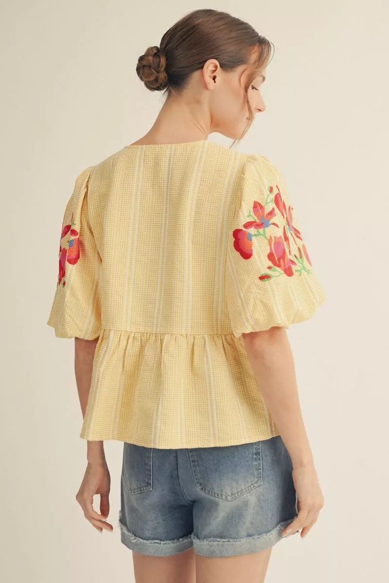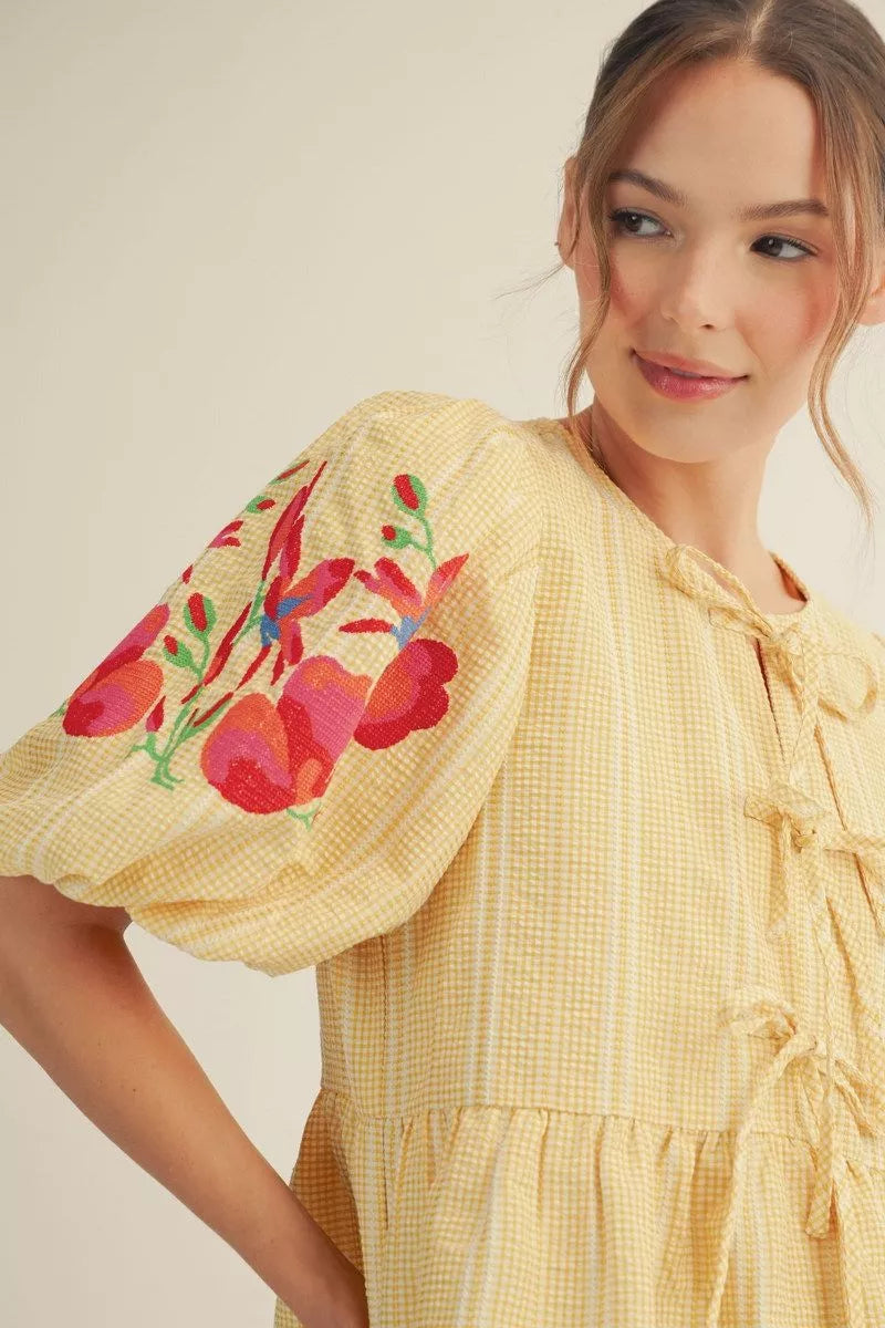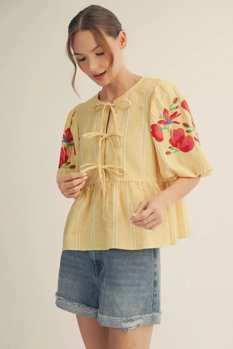 This charming peplum top features delicate embroidery over a tiny gingham check fabric, blending a soft romantic feel with an effortless everyday silhouette. Designed with feminine front tie closures, it creates a flattering, adjustable fit while adding a subtle vintage-inspired touch. The one-half sleeves are beautifully detailed with floral embroidery, giving the piece texture, color, and personality. The peplum shape offers gentle movement and a flattering finish, making it perfect to pair with denim or tailored bottoms for an easy yet elevated look.