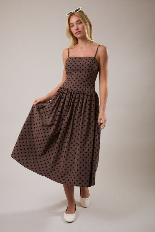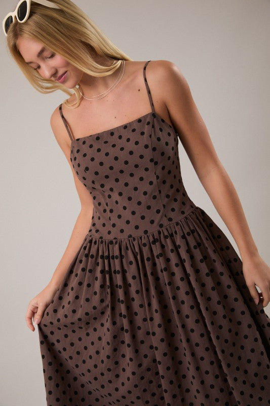 The Café Dot Midi Dress is a chic spaghetti-strap drop-waist midi dress designed to blend classic charm with modern ease. Featuring a playful dot pattern and a relaxed, flattering silhouette, this style delivers effortless movement and everyday elegance. Made from 100% cotton, it’s lightweight, breathable, and perfect for any occasion.