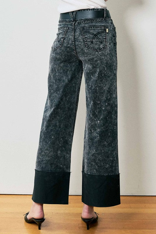 Charcoal Cuff Jeans are high-rise, wide-leg jeans designed with a bold stonewashed finish and striking contrast folded cuffs. They feature a classic five-pocket construction, zip-fly closure, and structured silhouette that blends vintage vibes with a modern edge. Made from a blend of 80% cotton, 19% polyester, and 1% spandex, they offer just the right amount of stretch for everyday comfort without compromising style.