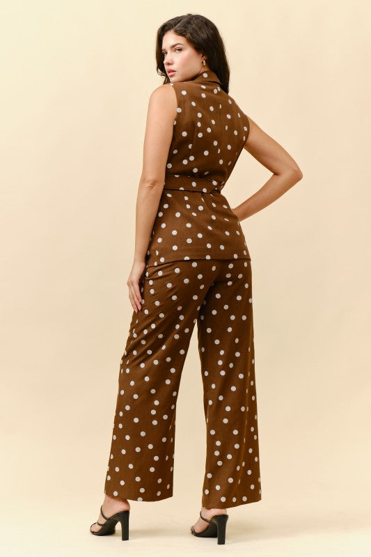 The Choco Polka Set is a playful yet sophisticated polka-dot ensemble featuring a belted vest and matching pants. The vest is designed with a flattering tailored cut, detailed with two front buttons and two pockets for a structured finish. The coordinating pants include side pockets and a relaxed straight-leg fit, making the set both chic and versatile. Fabric content: 100% polyester.
