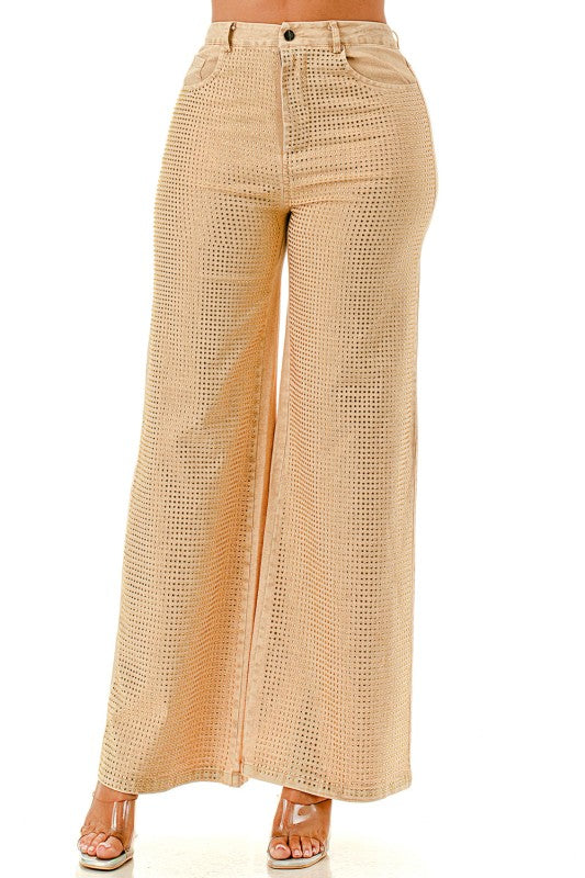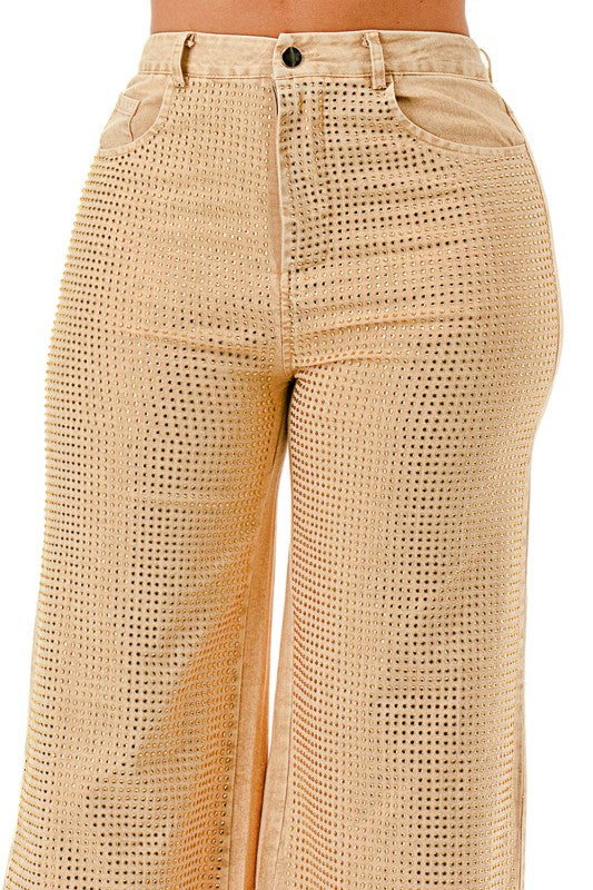 A classic pair of jeans designed to shine in the front. These cream denim jeans feature all-over stud embellishment on the front for a subtle sparkle moment, while the back is kept clean and minimal for a sleek, flattering finish. Crafted from a surprisingly stretchy denim that moves with you, they offer all-day comfort without sacrificing style. Finished with a zip-fly closure and functional front and side pockets, this pair is made for spring–summer nights, dinners, and going-out plans when you want effortless glow with zero effort.