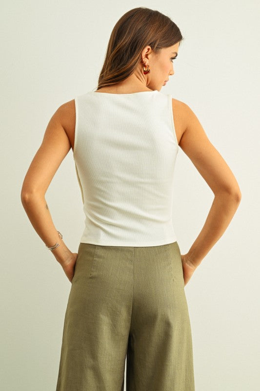 Cream Button Top is a ribbed, sleeveless tank designed with a sleek side button detail that gives it an unexpected edge. Fitted but comfortable, this top is one of those effortless pieces that instantly elevates your everyday look. Easy to dress up or keep casual, it’s a go-to staple with just the right amount of attitude.