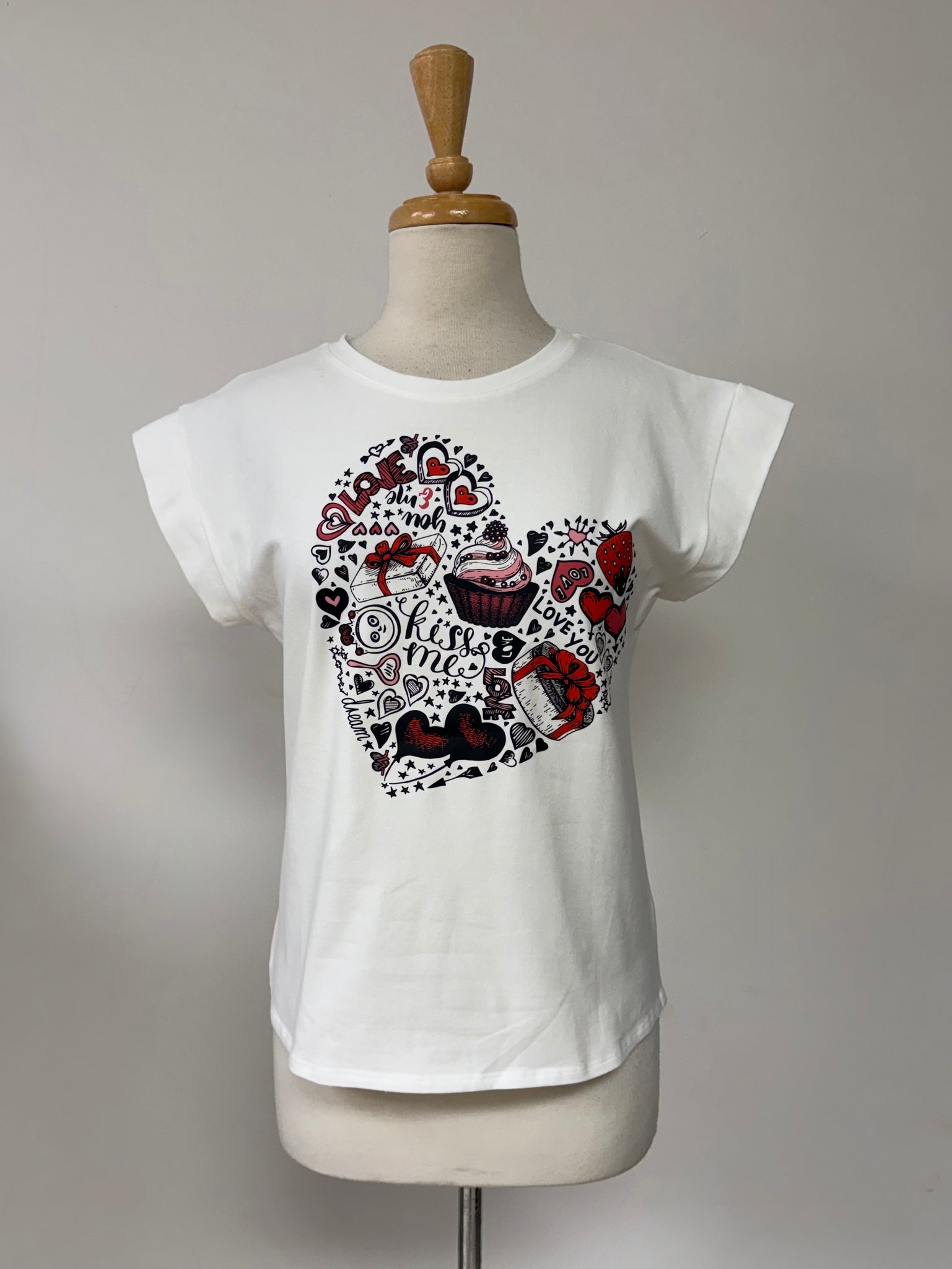 Cupid Sketch Tee is a playful graphic top featuring an all-over love-sketch print with hearts, sweets, and flirty doodles that give it a bold, fun attitude. Designed as a print boxer top, it has a relaxed fit with rolled sleeves for that effortlessly cool, wear-it-anywhere vibe. Easy to style, easy to love, and definitely not basic.