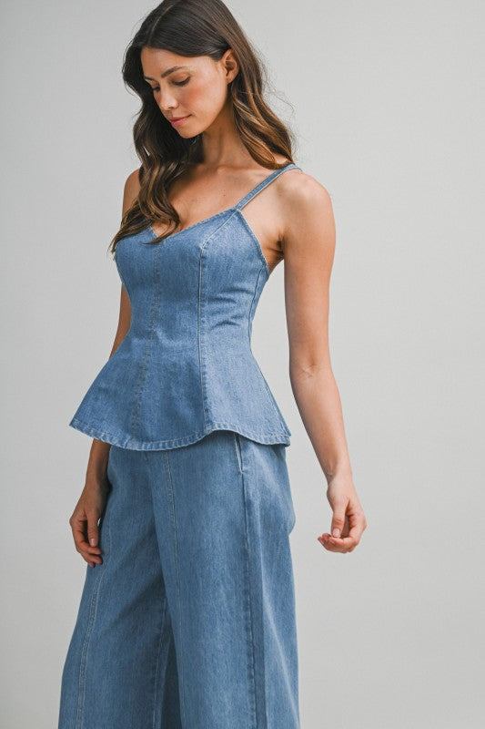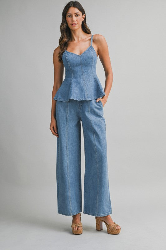 The Denim Edit Set brings cool-girl energy with a polished edge. Featuring an adjustable spaghetti strap peplum top with a sweetheart neckline, this set flatters in all the right places while keeping it effortless. The matching denim jeans are finished with front button details and side pockets, adding a laid-back yet elevated vibe. Wear it together for a bold statement or style each piece solo for endless outfit edits.