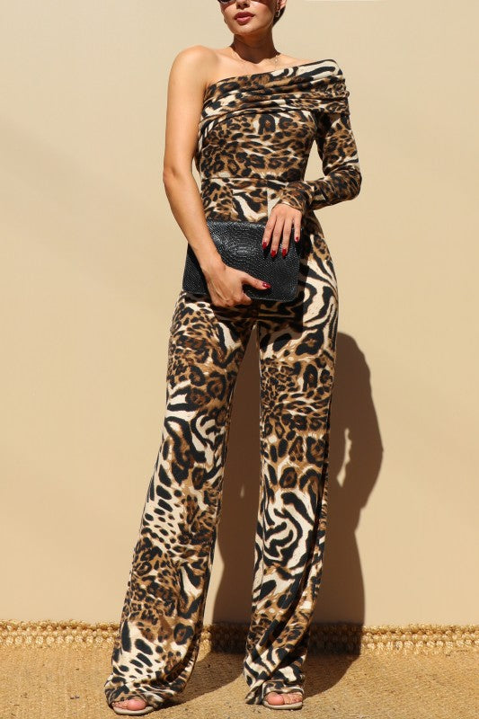 Bold, sultry, and unapologetically confident. The Feral Chic Jumpsuit features a sleek, body-hugging silhouette with a low-cut neckline and a striking one-shoulder design that delivers instant attitude. Clean lines keep it refined while the animal print adds that effortless, feral edge. Finished with a side invisible zipper for a smooth, flattering fit, this jumpsuit is where wild energy meets elevated style.