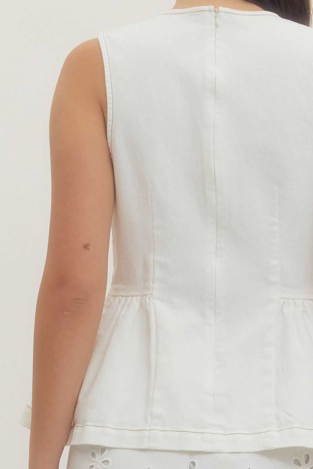 A polished take on everyday denim, this solid sleeveless peplum top features contrast top-stitching that highlights its structured shape. Designed with a flattering fitted bodice and subtle flare at the hem, it finishes with a clean back zipper closure for an effortless, tailored look. Easy to dress up or down, this top brings soft structure and modern femininity to any outfit.