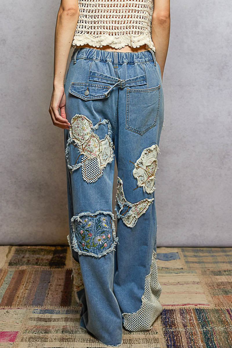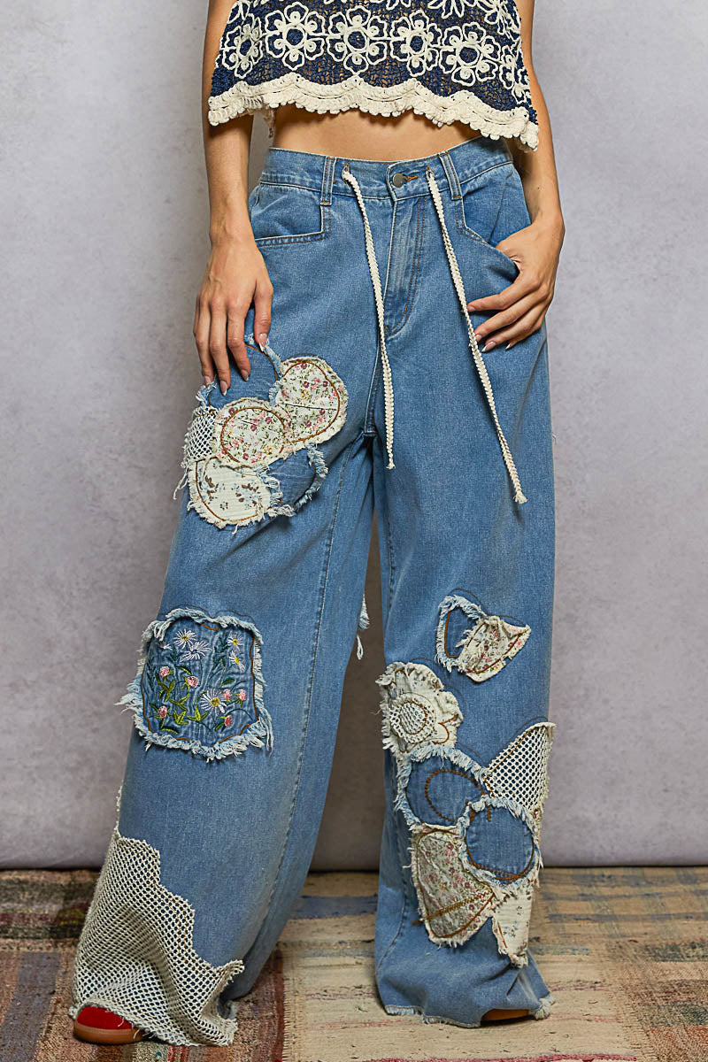 A true statement piece with an effortless, vintage-inspired aesthetic. The Flower Patch Denim is a wide-leg patchwork woven pant designed with artisanal detailing throughout. Featuring a mid-rise waist, classic five-pocket construction, and a buckle-back detail, it offers a relaxed straight-to-wide silhouette for easy movement. The legs are accented with mixed fabric appliqué, floral embroidery, raw-edge patches, and a mesh insert that adds rich texture and visual depth. Finished with a wide drawstring accent at the waist for an adjustable, laid-back fit. Fabric content: 100% cotton.