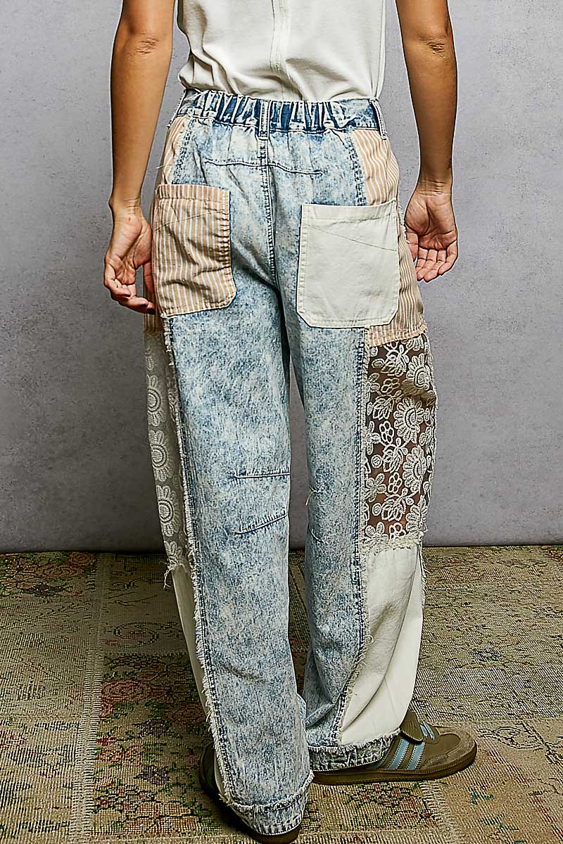 Designed in a relaxed barrel-fit silhouette, these statement denim pants blend handcrafted character with effortless cool. Featuring dart detailing for shape, raw-edge finishes, lace panel accents, and stripe contrast inserts, each detail adds a layered, artisanal feel. The wide, sculpted leg gives them a modern edge while keeping the look easy and wearable. A true standout denim made to elevate simple tops and bold styling alike.