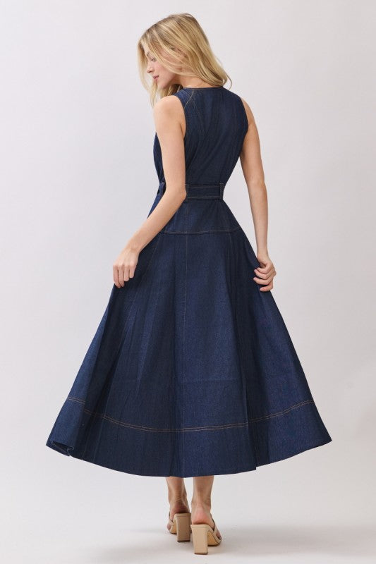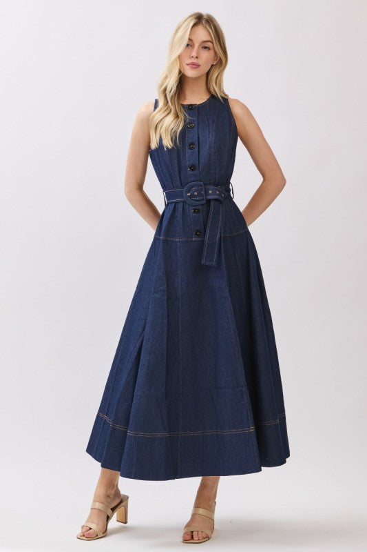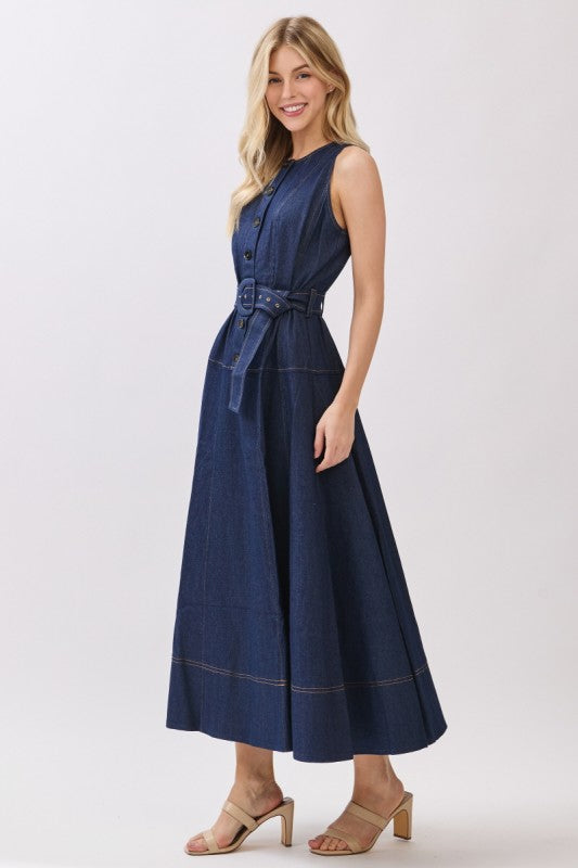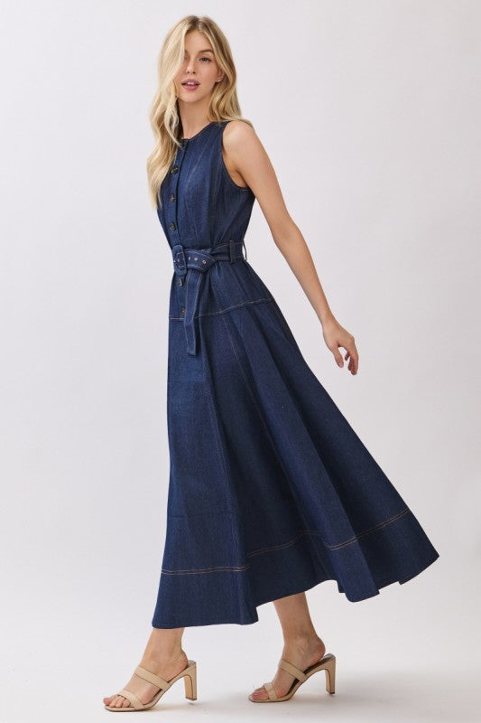 A sleek take on denim dressing, this woven sleeveless maxi dress features a clean button-down front and a self-tie belt that defines the waist while keeping the silhouette effortless. Cut in a long, structured column shape, it balances tailored lines with everyday ease. Polished yet modern, this denim maxi is designed to move seamlessly from daytime styling to elevated evening looks.