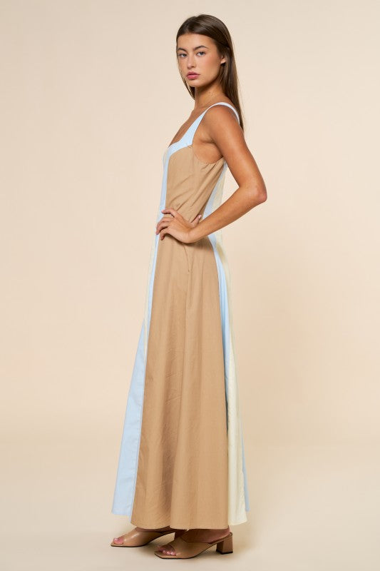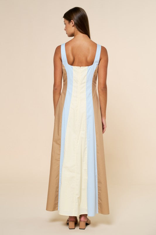 A true standout in soft neutral tones, the Ivory Horizon Maxi features a color-blocked design that creates a striking yet elegant silhouette. This sleeveless maxi dress is framed with a modern square neckline and vertical paneling that elongates the figure beautifully. Crafted from breathable 100% cotton, it flows effortlessly with every step while keeping a polished, elevated look. Finished with a sleek back zipper closure, this piece blends comfort with statement style — perfect for coastal days, city strolls, and everything in between.