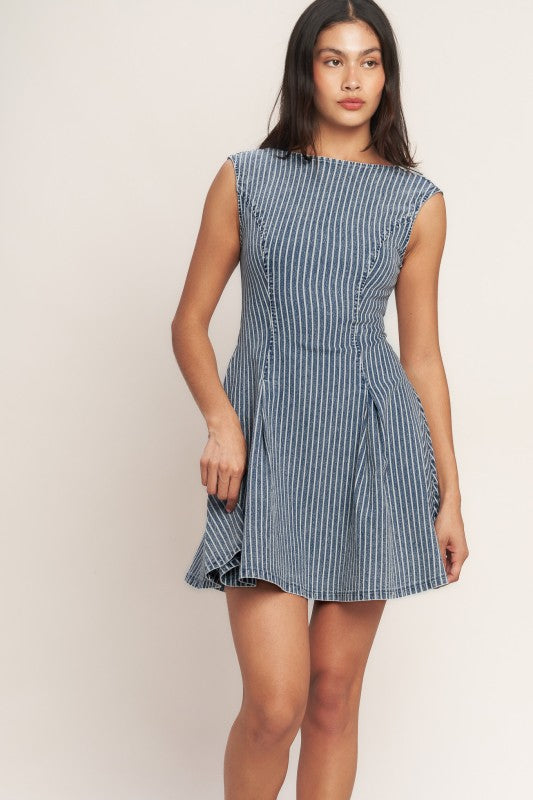 A striped denim mini dress featuring a round neckline, sleeveless silhouette, and a flattering circle skirt. Designed with a statement cutout back and a button-and-zipper closure for a secure fit. Structured yet easy, this piece blends tailored lines with playful movement.