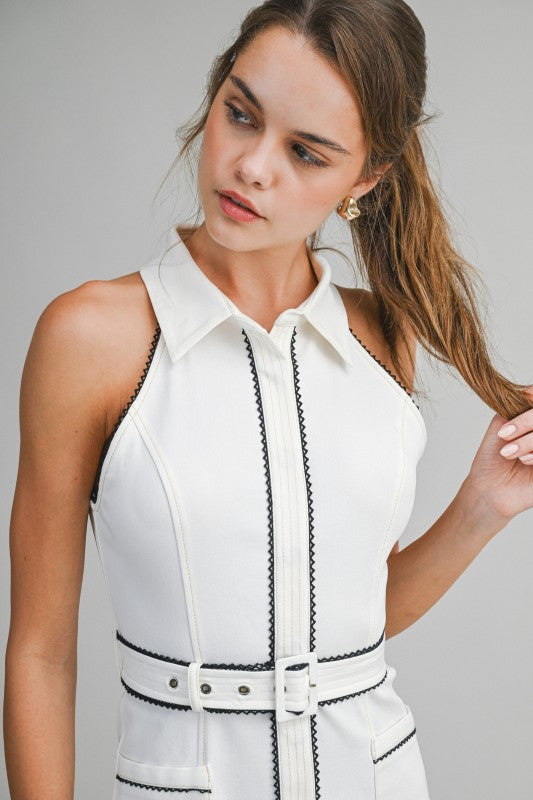 Sharp. Polished. Effortlessly powerful. The Milano Trim Midi is a contrast-trim halter midi dress designed with clean black detailing for a modern, structured finish.