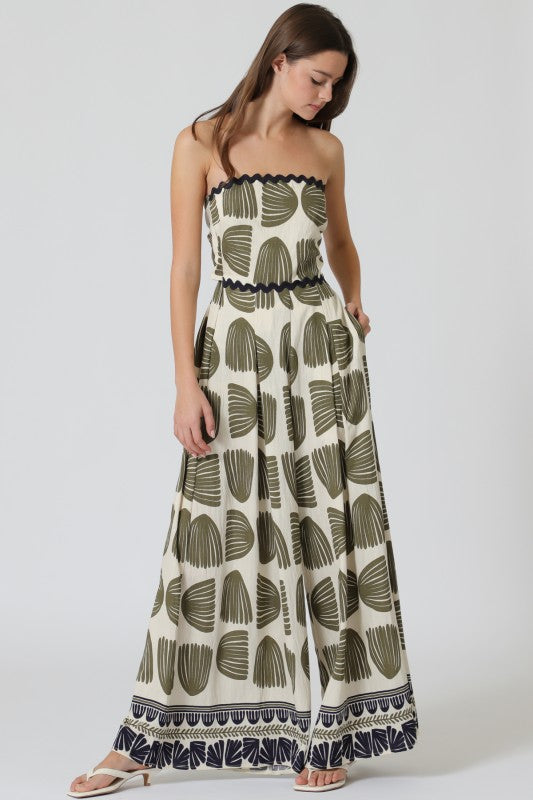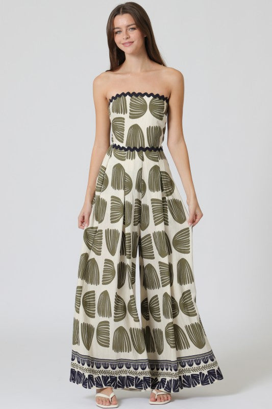 This strapless jumpsuit is all about effortless impact, featuring a wave-trim chest detail that adds a subtle statement up top. Designed with an elasticized back waist for a comfortable, flattering fit, it also includes adjustable back tie straps so you can shape it just the way you like. The flowy silhouette moves beautifully with every step, while side pockets keep it practical and easy for all-day wear. Lightweight and breezy, this is the kind of one-piece that takes you from sunny days to warm nights without trying too hard.