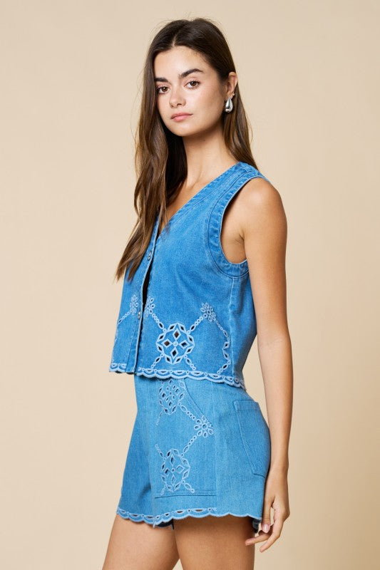 Light, feminine, and effortlessly refined. The Riviera Eyelet Vest features a flattering V-neckline and intricate embroidered detailing that adds texture and charm to every look. Finished with a delicate scalloped hem, this sleeveless silhouette feels breezy yet polished, making it perfect for warm days and easy layering. Soft with a hint of stretch, it blends comfort and structure for a beautifully tailored feel.