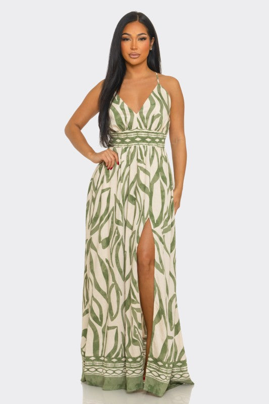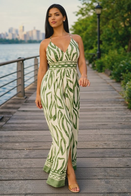 The Sage Leaf Maxi brings effortless resort energy with a fresh, spring–summer feel. Designed with a flattering V-neckline and adjustable spaghetti straps, it features an all-over leaf print that feels light and elevated. The back includes an elastic waistband for comfort and shape, plus adjustable tie-back straps that let you customize the fit. Finished with a flowy maxi-length skirt and a front slit for easy movement and a subtle hint of skin. Easy, breezy, and made for sunny days and warm nights. Fabric content: 90% rayon, 10% nylon.