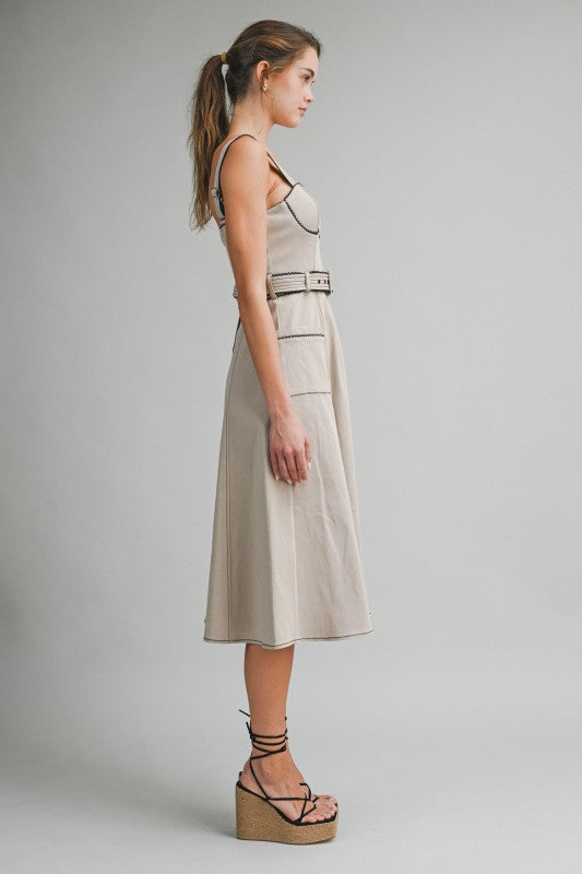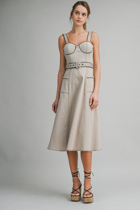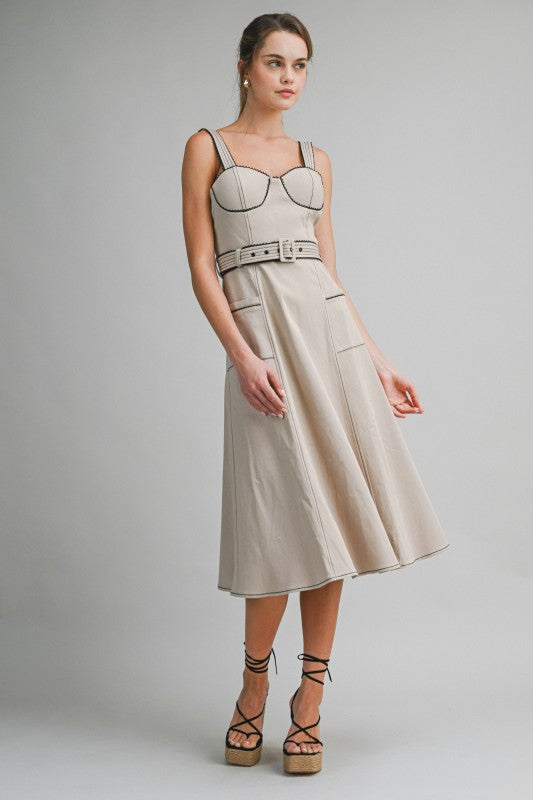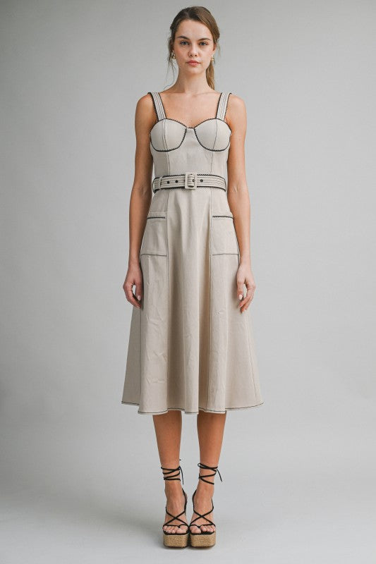 Clean lines. Strong shape. Neutral power. The Sandstone Midi is a structured bust A-line dress designed to sculpt and flatter in all the right places. Bold contrast stitching defines the silhouette, while the fitted bodice and adjustable straps give you that tailored, confident fit.