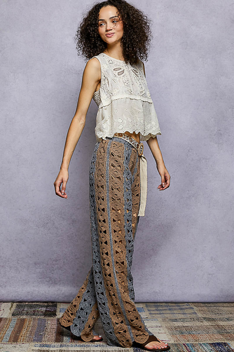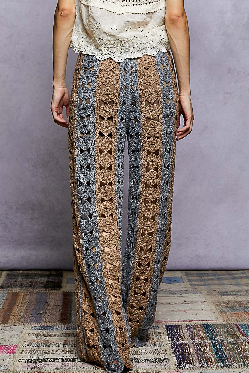 Designed with a relaxed straight-leg silhouette, the Stonewave Crochet Pants feature intricate crochet detailing with varied patterns and subtle striped accents throughout. An elastic waistband ensures a comfortable, flexible fit, while the lightweight crochet construction gives these pants an airy, artisanal feel. Finished with a short inner lining for coverage without compromising the open-weave look, this one-size style is perfect for effortless styling from day to night.