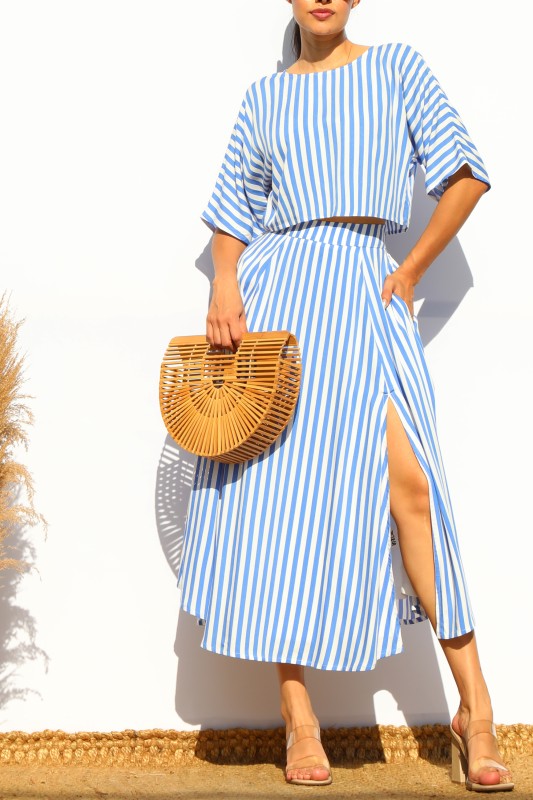 A fresh stripe moment made for sunny days. This two-piece set features a loose-fit striped top with a back keyhole and neck button closure, paired with a flowy flare midi skirt that moves beautifully with every step. The skirt includes side pockets, elastic at the back of the waist for an easy, comfortable fit, and a full lining for effortless wear. Light, breezy, and chic from day to night.