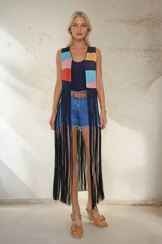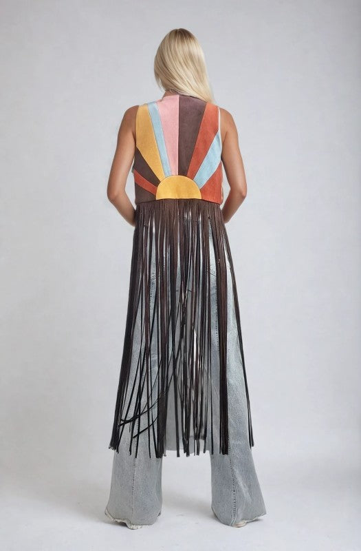 Make every entrance unforgettable with the Sunburst Fringe Vest — a premium maxi color-block sunrise design crafted in luxe faux suede. Its vibrant sunburst pattern brings a bold retro flair, while the dramatic maxi fringe adds movement, attitude, and a touch of western-boho magic to every step. Perfect for layering over denim or basics when you want your outfit to steal the spotlight. Fabric content: 98% polyester, 2% spandex