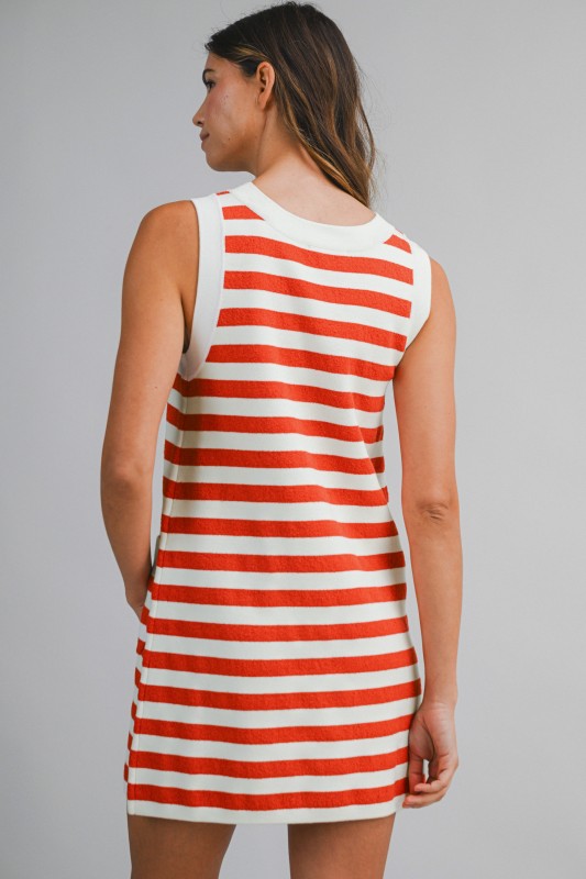 A sleeveless knit mini dress featuring a classic crew neckline and a clean straight silhouette. Designed with an all-over horizontal stripe pattern and finished with a front patch pocket for a cool, effortless touch. The soft terry-feel knit gives it that laid-back, resort-ready vibe that works from sunny strolls to casual cocktails. Easy, breathable, and unapologetically fun.