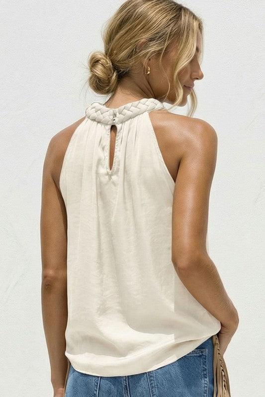 Soft, refined, and effortlessly striking. The Vanilla Braidline Top features a beautifully braided neckline that adds a sculptural, elevated touch while the fluid silhouette drapes with ease. Its sleeveless design keeps the look modern and versatile, perfect for pairing with denim, tailored pants, or statement skirts. Polished yet relaxed, this is the kind of top that instantly elevates your everyday style.